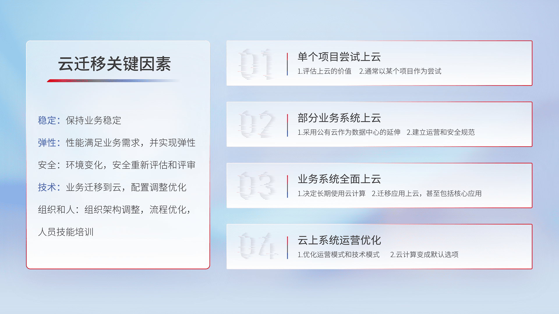 结合实际业务,,,,从规划设计、、云平台选型、、、、云原生改造、、数据迁移、、、、集成交付,,,迁移全过程为客户识别最佳上云路径,,,,做好风险识别管理,,,设计网络架构、、身份权限、、安全审计合规、、操作审计、、、日志审计、、、监控告警策略、、、多站点容灾设计等,,,对云上基础设施进行整体规划,,,,提升IT治理水平,,,,以满足弹性、、、、高可用、、、、高性能的需求。。。。