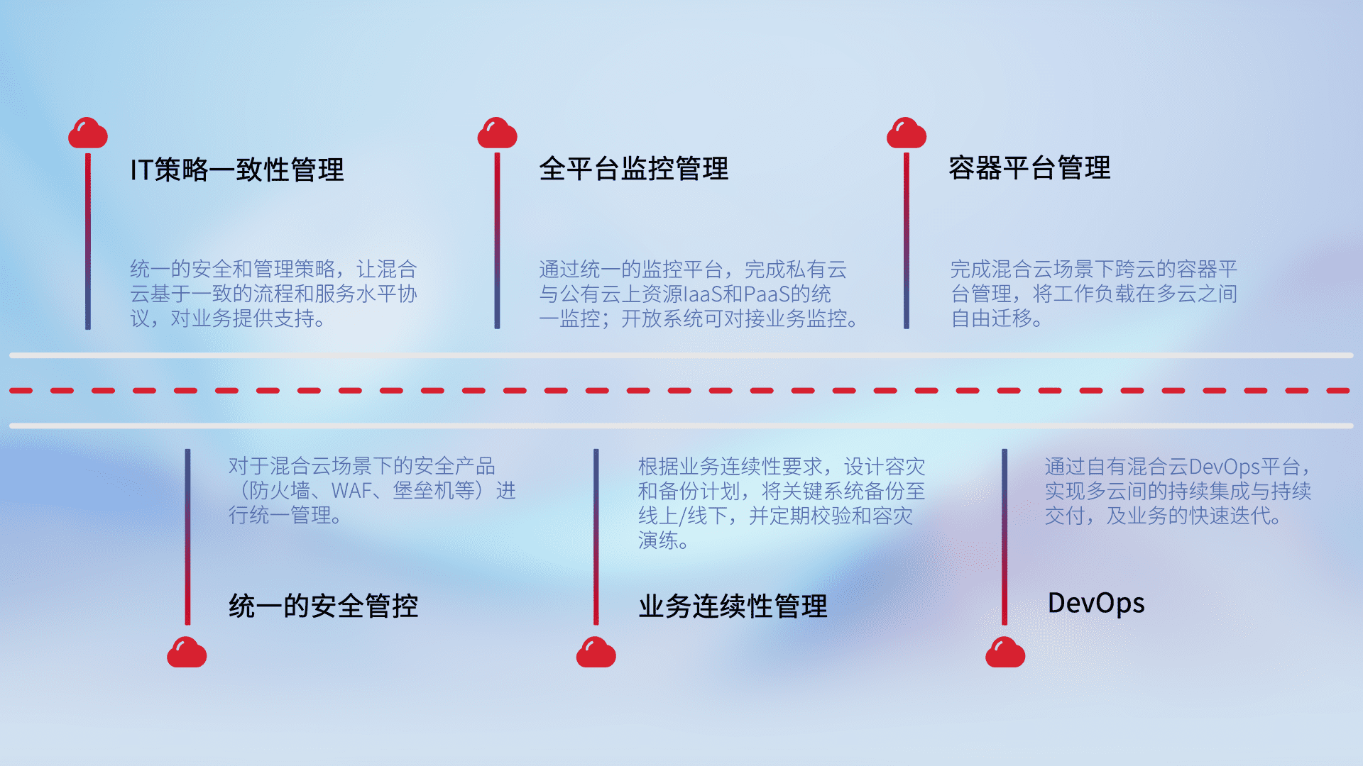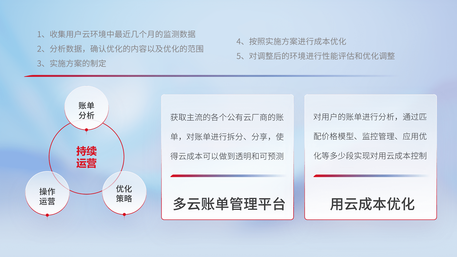 通过多云纳管,,,,以统一的资源数据模型把客户的云资源进行抽象和封装,,,进而实现对多云资源的统一操作,,保障云资源管理的可靠性、、稳定性与可用性。。量身定制化运维内容,,,,配置、、、开发运维、、、、补丁管理、、、、备份、、、、监控、、认证和访问管理、、、审计和日常巡检等,,,,保障在用云过程中的可靠度,,,稳定度以及高可用率。。。。